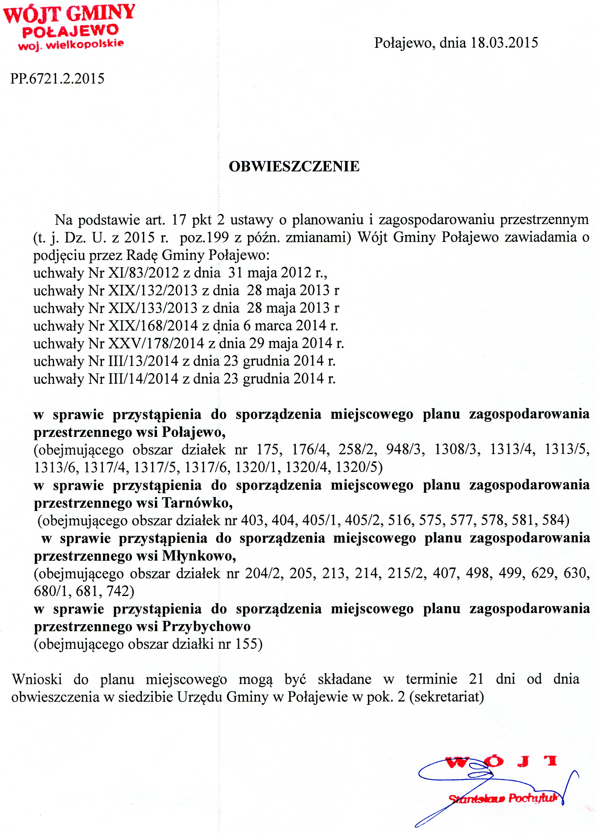 Na podstawie art. 17 pkt 2 ustawy o planowaniu i zagospodarowaniu przestrzennym (t. j. Dz. U. z 2015 r. poz.199 z późn. zmianami) Wójt Gminy Połajewo zawiadamia o podjęciu przez Radę Gminy Połajewo: