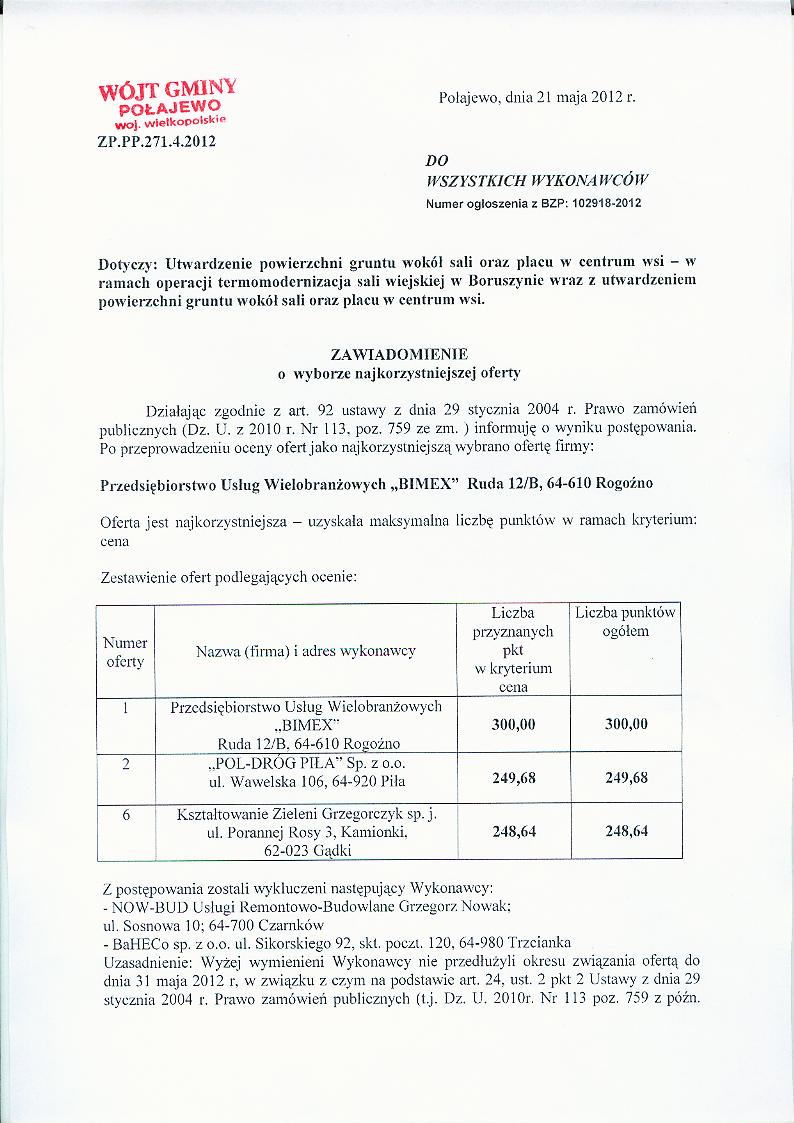 Zapraszam do obejrzenia strony „Zawiadomienie o wyborze najkorzystniejszej oferty - Przetargi o wartości powyżej 30.000 EURO - do 31.12.2020 r., menu 1002, artykuł 1757 - BIP - Urząd Gminy Połajewo”