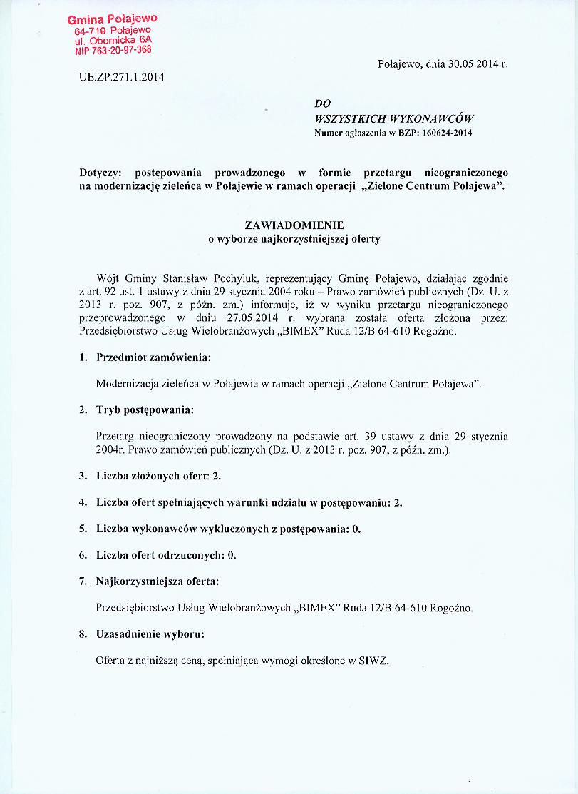 Ogłoszenie o wyborze najkorzystniejszej oferty w przetargu nieograniczonym na modernizację zieleńca w Połajewie w ramach operacji "Zielone Centrum Połajewa".