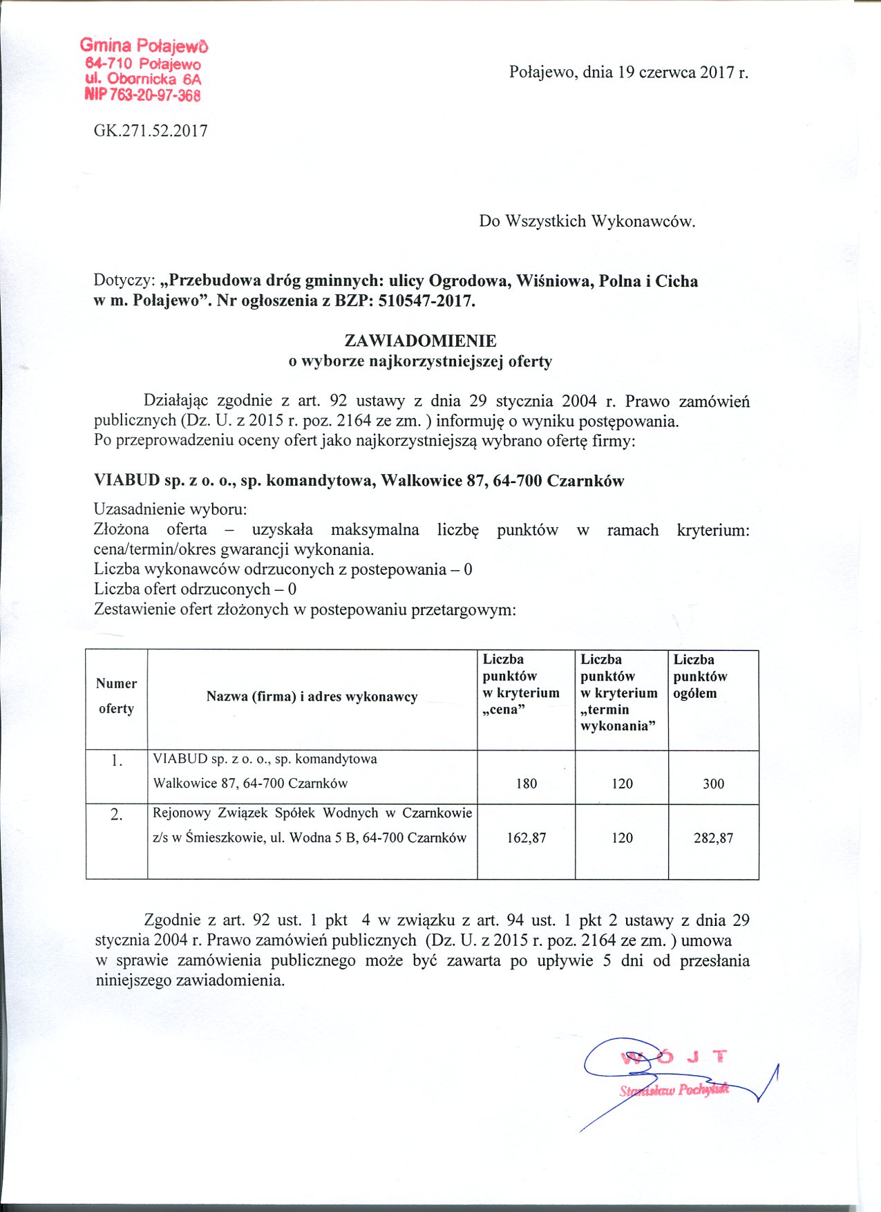 Zawiadomienie o wyborze najkorzystniejszej oferty w przetargu nieograniczonym na przebudowę dróg gminnych: ulice Ogrodowa, Wiśniowa, Polna i Cicha w m. Połajewo
