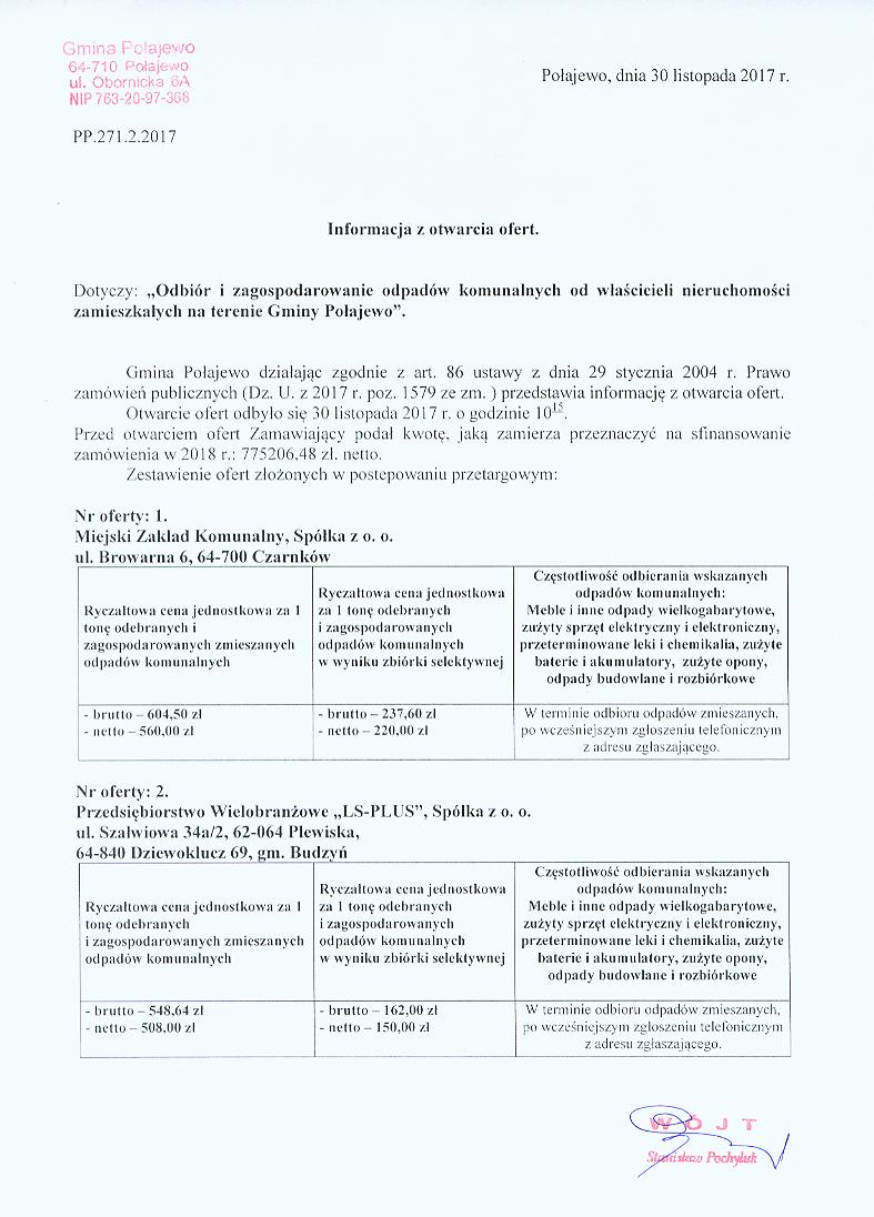 Informacja z otwarcia ofert w przetargu na odbiór i zagospodarowanie odpadów komunalnych od właścicieli nieruchomości zamieszkałych na terenie Gminy Połajewo