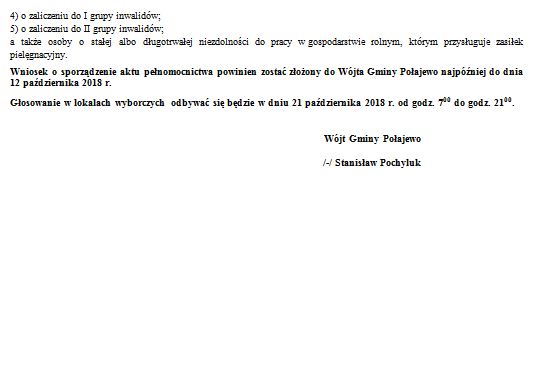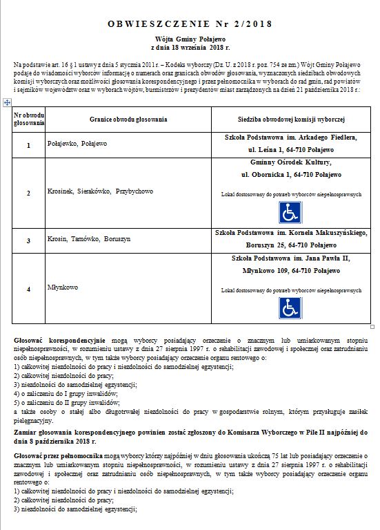 OBWIESZCZENIE Nr 2/2018 Wójta Gminy Połajewo z dnia 18 września 2018 r.o numerach oraz granicach obwodów głosowania, wyznaczonych siedzibach obwodowych komisji wyborczych oraz możliwości głosowania korespondencyjnego i