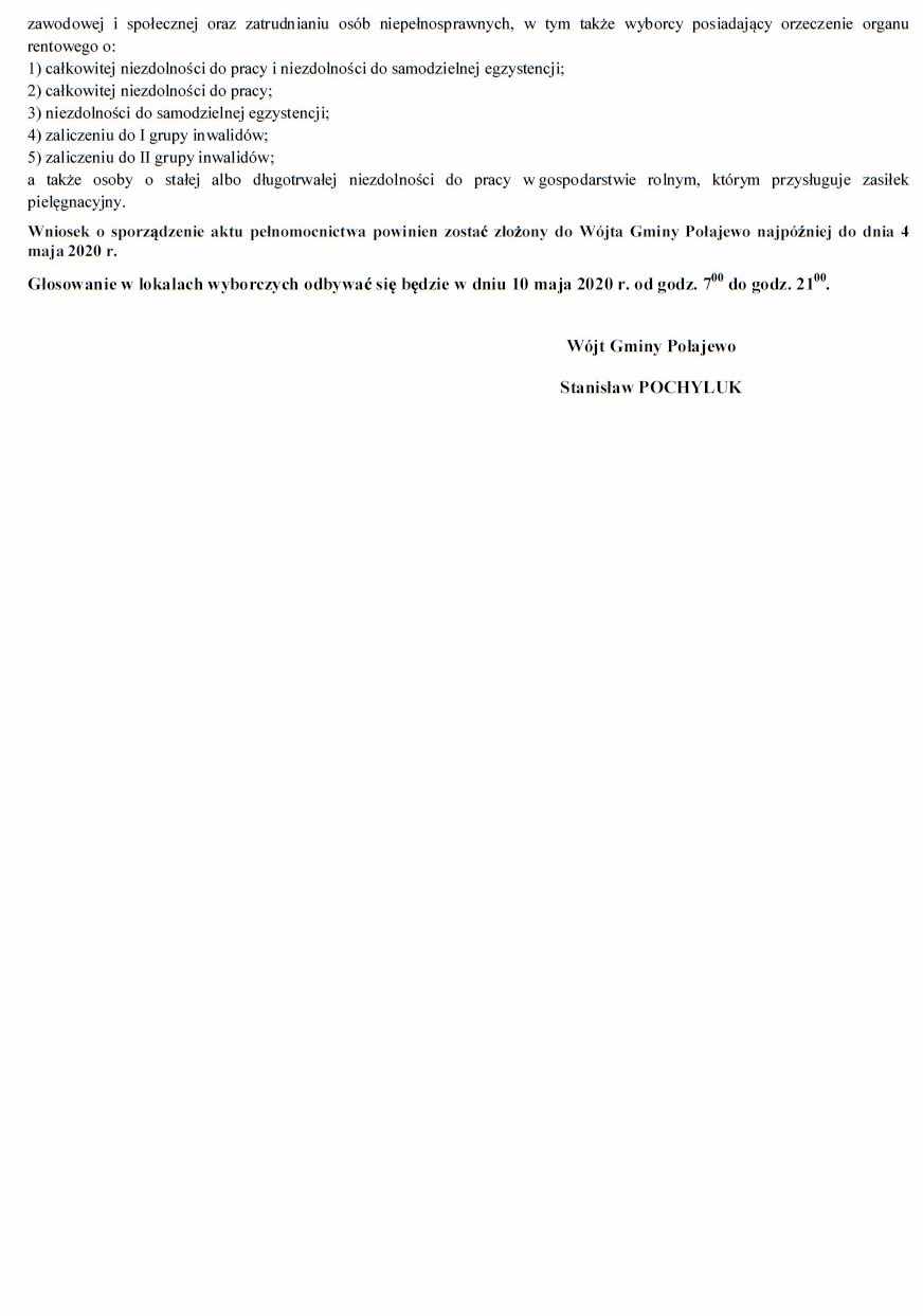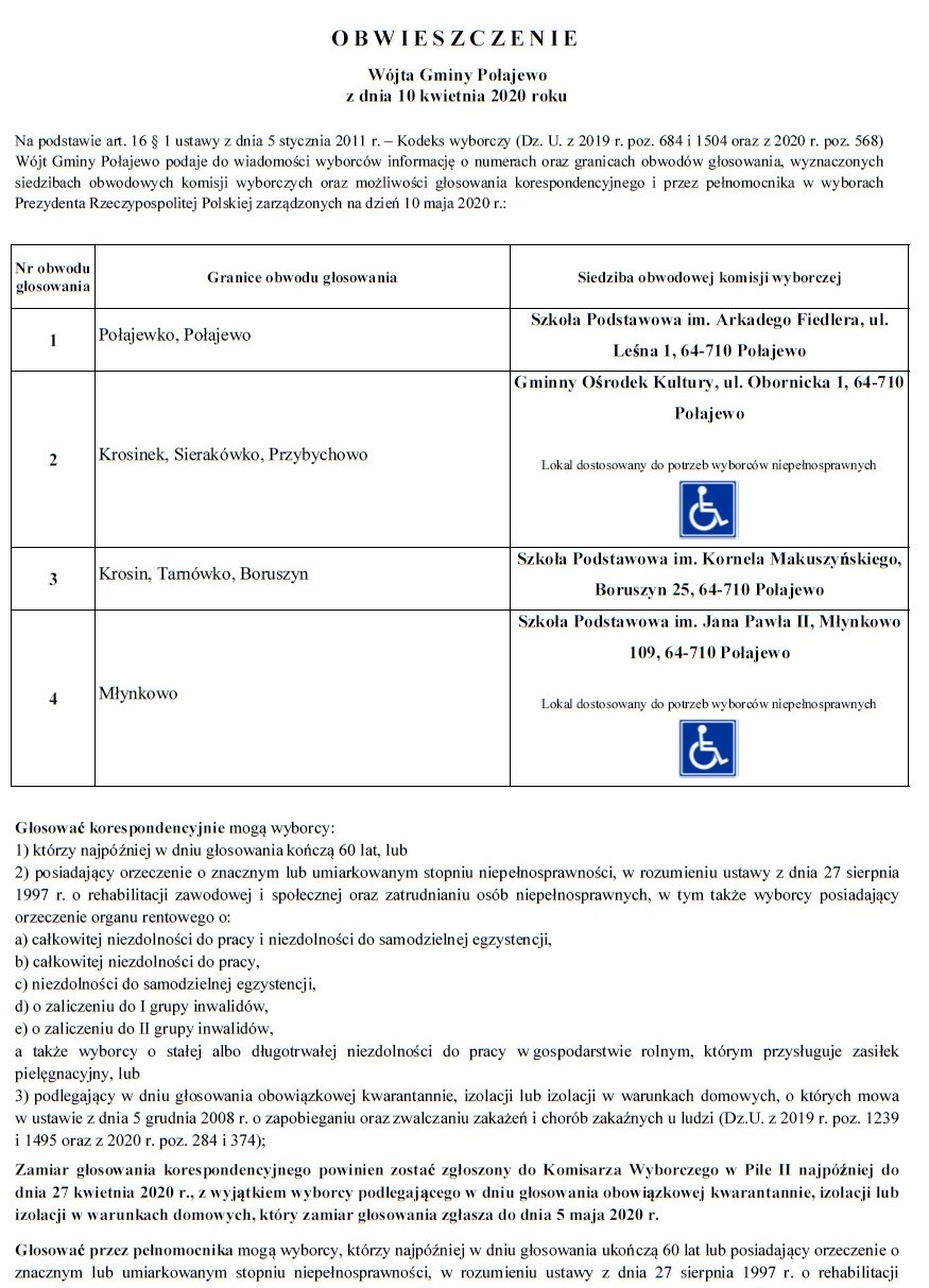 O BWI E S Z C Z E N I E Wójta Gminy Połajewo z dnia 10 kwietnia 2020 roku o numerach oraz granicach obwodów głosowania, wyznaczonych siedzibach obwodowych komisji wyborczych oraz możliwości głosowania korespondencyjnego